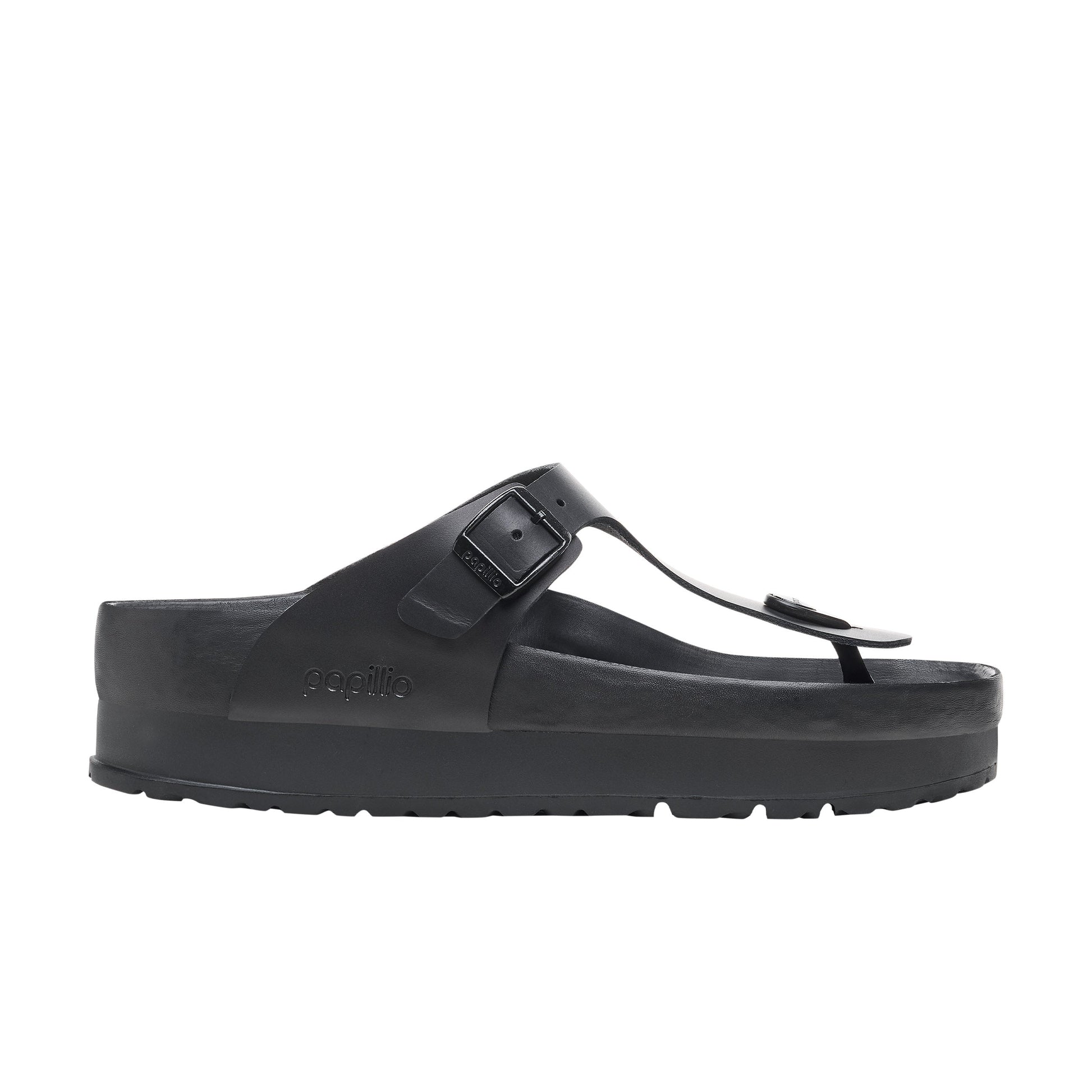 The Birkenstock Gizeh is a stylish all-rounder: extremely versatile yet unbelievably comfortable. A flexible platform sole takes the Gizeh's classic design to new heights this season, paired with an exquisite leather lined footbed and smooth leather upper. This Papillio By Birkenstock style rests on a supportive, contoured footbed.